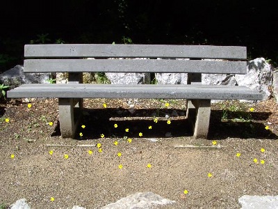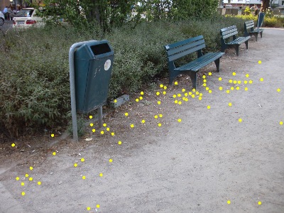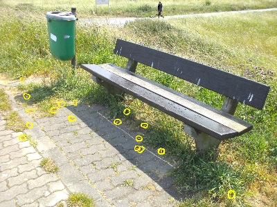 (Anm.: Auf dem oberen Foto sind die in der Fotodatei sichtbaren Kippen im Bereich der 1. Sitzbank markiert, auf dem unteren Foto diejenigen der rechten Bank)